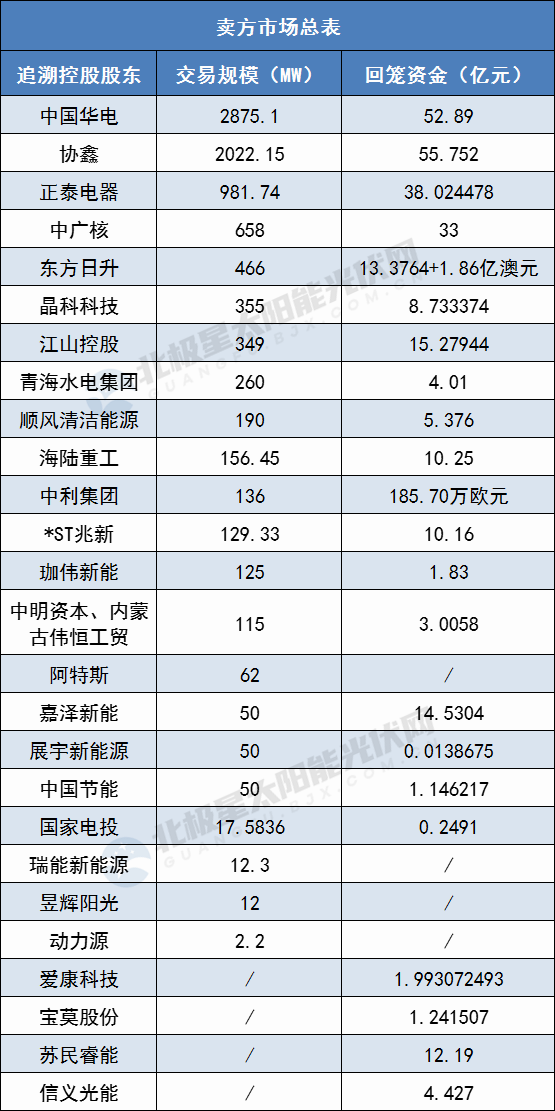 具體來(lái)看,華電集團(tuán)收購(gòu)總量達(dá)2875.1MW,排名買方第一。10月28日,華電國(guó)際股份發(fā)布公告稱,公司及其若干附屬公司及分公司與福新發(fā)展及其若干附屬公司及分公司分別簽訂新能源股權(quán)出售協(xié)議、新能源資產(chǎn)出售協(xié)議及新能源前期項(xiàng)目轉(zhuǎn)讓協(xié)議,協(xié)議標(biāo)的涉及光伏、風(fēng)電電站資產(chǎn)超過(guò)2875.1MW,交易金額高達(dá)52.89億元。今年上半年,華電集團(tuán)宣布新能源資產(chǎn)重組完成,經(jīng)過(guò)兩批光伏、風(fēng)電資產(chǎn)重組工作,華電福新發(fā)展成為華電集團(tuán)唯一的新能源業(yè)務(wù)發(fā)展平臺(tái),同時(shí),華電集團(tuán)表示,“十四五”期間,華電集團(tuán)將以福新發(fā)展為平臺(tái)大力發(fā)展新能源,并將打造千億市值新能源航母。10月份華電國(guó)際股份與福新發(fā)展間的光伏電站交易不僅是華電“千億市值新能源航母”打造計(jì)劃的重要進(jìn)展,也讓華電成為了今年單筆交易規(guī)模最大的企業(yè)。