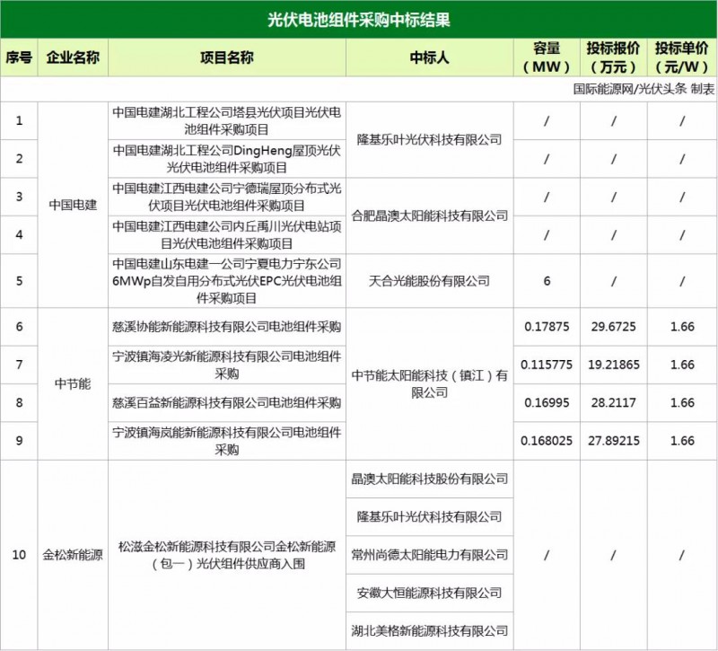 近日,中國(guó)電建、中節(jié)能、金松新能源發(fā)布光伏電池組件、光伏逆變器、光伏支架等項(xiàng)目中標(biāo)結(jié)果公告。規(guī)模合計(jì)為212.6325MW。