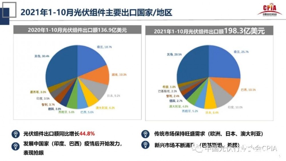 緊接著,王勃華對(duì)2020年和2021年光伏組件主要出口國(guó)家/地區(qū)做了介紹。2021年1-10月光伏組件出口額為198.3億美元,其中,歐洲、日本、澳大利亞等傳統(tǒng)市場(chǎng)國(guó)家保持旺盛需求,巴基斯坦、希臘等新興市場(chǎng)也不斷涌現(xiàn)出來(lái)。對(duì)比2020年,2020年1-10月光伏組件出口額為136.9億美元,同比增長(zhǎng)44.8%,其中,印度、巴西等發(fā)展中國(guó)家在疫情后開(kāi)始發(fā)力,表現(xiàn)十分搶眼。