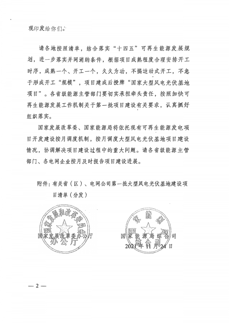 根據(jù)文件,請各地按照清單,結(jié)合落實“十四五”可再生能源發(fā)展規(guī)劃,進(jìn)一步落實并網(wǎng)消納條件,根據(jù)項目成熟程度合理安排開工時序,成熟一個、開工一個,久久為功,不搞運(yùn)動式開工,不急于形成開工“規(guī)模”,項目建成后授牌“國家大型風(fēng)電光伏基地項目”。各省級能源主管部門要切實承擔(dān)牽頭責(zé)任,按照加快可再生能源發(fā)展工作機(jī)制關(guān)于第一批項目建設(shè)有關(guān)要求,認(rèn)真抓好組織落實。