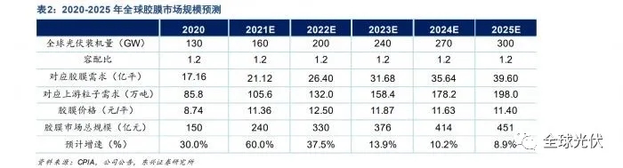 預(yù)計(jì),2021-2023年全球光伏膠膜需求約為21.1、26.4和31.7億平方米,同比增長23%、25%和20%。到2025年,全球膠膜市場或達(dá)452億元規(guī)模,復(fù)合增速為17%。