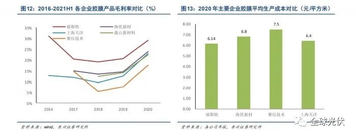 東興證券認(rèn)為,上游粒子廠商陸續(xù)投產(chǎn),光伏級粒子供給瓶頸將得到緩解,2021年原料成本端大幅上漲的壓力大概率不會(huì)延續(xù)到2022年,光伏膠膜成本有望得到進(jìn)一步控制和降低。與此同時(shí),受益光伏裝機(jī)需求增長,預(yù)計(jì)膠膜售價(jià)有望持續(xù)堅(jiān)挺。對于相關(guān)標(biāo)的來說,相較2021年,今年膠膜生產(chǎn)企業(yè)將會(huì)展現(xiàn)成本優(yōu)勢,毛利率有望大幅上漲。綜合來看,膠膜行業(yè)議價(jià)能力和盈利能力都將有提升和改善。