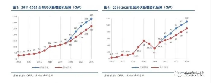 目前,全球已有130多個(gè)國家和地區(qū)相繼宣布碳中和目標(biāo),在全球提升可再生能源消費(fèi)比重的大背景下,全球新增風(fēng)光裝機(jī)將持續(xù)快速增長。根據(jù)光伏年度大會(huì)理事長王勃華預(yù)期,預(yù)計(jì)2021年全球光伏新增裝機(jī)量為150-170GW,并在未來幾年繼續(xù)保持年均30-40GW的增長,預(yù)計(jì)2025年新增全球裝機(jī)量將達(dá)270-330GW,新增裝機(jī)復(fù)合增速約17%。