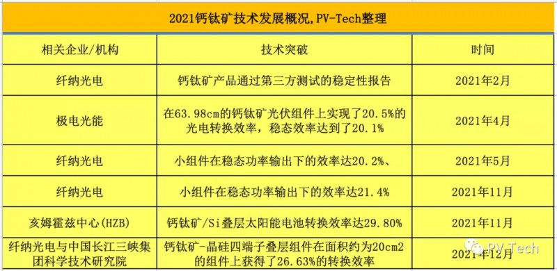 2021年各企業(yè)及研究機構(gòu)鈣鈦礦技術(shù)突破匯總,PV-Tech整理