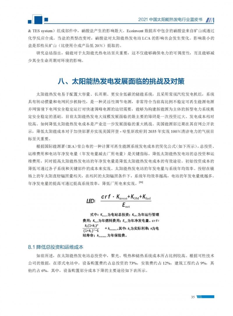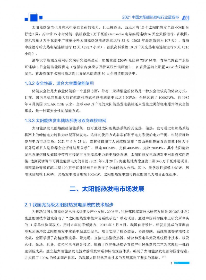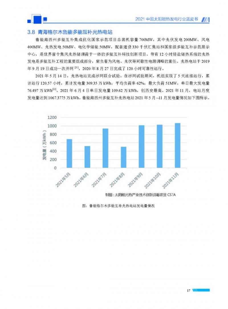 近日,由國家太陽能光熱產(chǎn)業(yè)技術(shù)創(chuàng)新戰(zhàn)略聯(lián)盟、中國可再生能源學會太陽能熱發(fā)電專業(yè)委員會、中關(guān)村新源太陽能熱利用技術(shù)服務中心聯(lián)合編制的《2021中國太陽能熱發(fā)電行業(yè)藍皮書》發(fā)布。