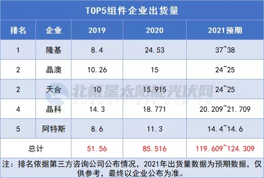 梳理2017年~2021年連續(xù)5年全球組件出貨量排名,TOP5企業(yè)巋然不對,僅排序略有變化。2019年,TOP5企業(yè)即隆基、晶科、天合、晶澳、阿特斯5家企業(yè)組件總出貨量51.56GW,2020年這一數(shù)字增長至85.5GW,而2021年再攀高峰突破120GW。據(jù)BNEF彭博新能源財經(jīng)預(yù)測,2021年全球光伏新增裝機或達183GW。這也意味著TOP5組件企業(yè)的市場占比達到六成以上。