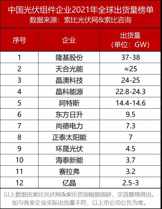 從索比光伏網(wǎng)&索比咨詢發(fā)布的《中國光伏組件企業(yè)2021年全球出貨量榜單》看,隆基股份、天合光能、晶澳科技、晶科能源、阿特斯、東方日升、尚德電力、正泰太陽能、環(huán)晟光伏、海泰新能、賽拉弗、億晶光電等企業(yè)名列前茅,出貨量合計約140GW,占全球組件總需求的75%以上。無論在國內還是海外市場,他們都斬獲頗豐。