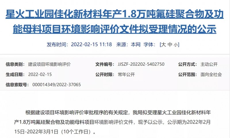 星火工業(yè)園佳化新材料年產(chǎn)1.8萬噸氟硅聚合物及功能母料項(xiàng)目