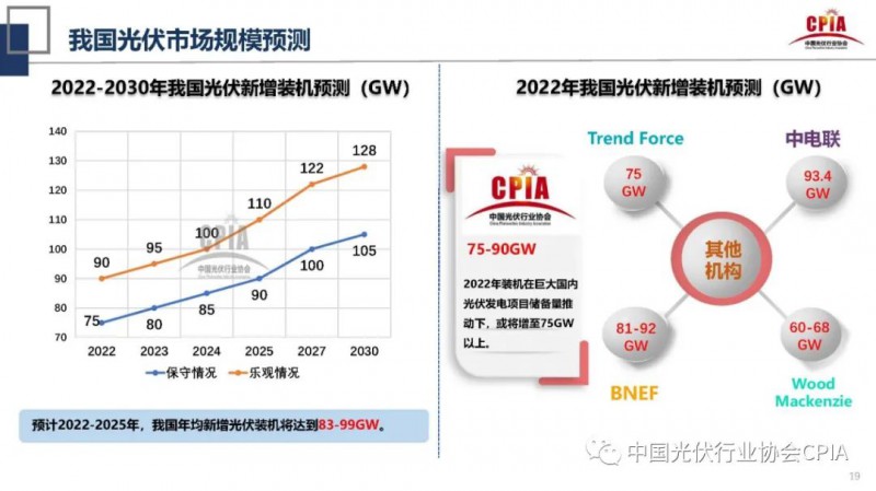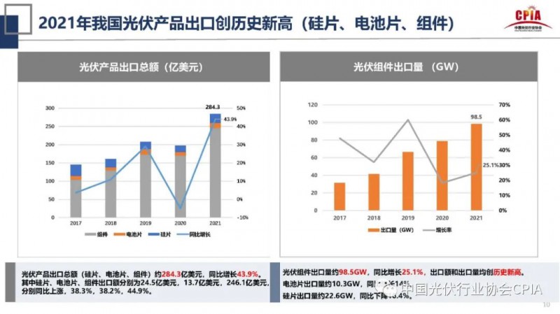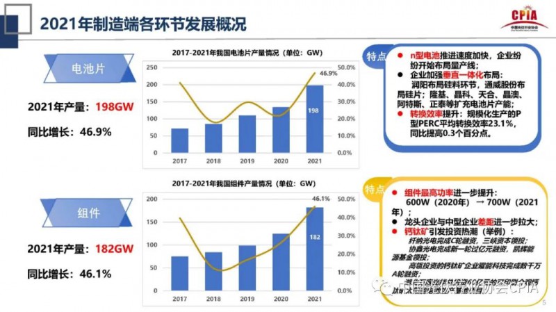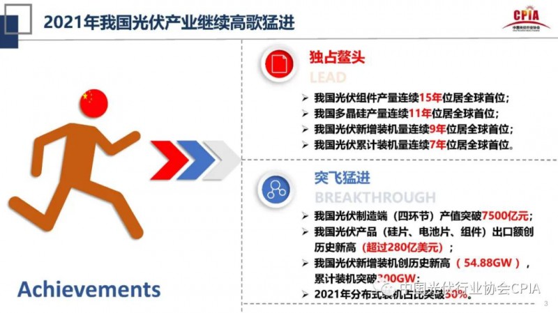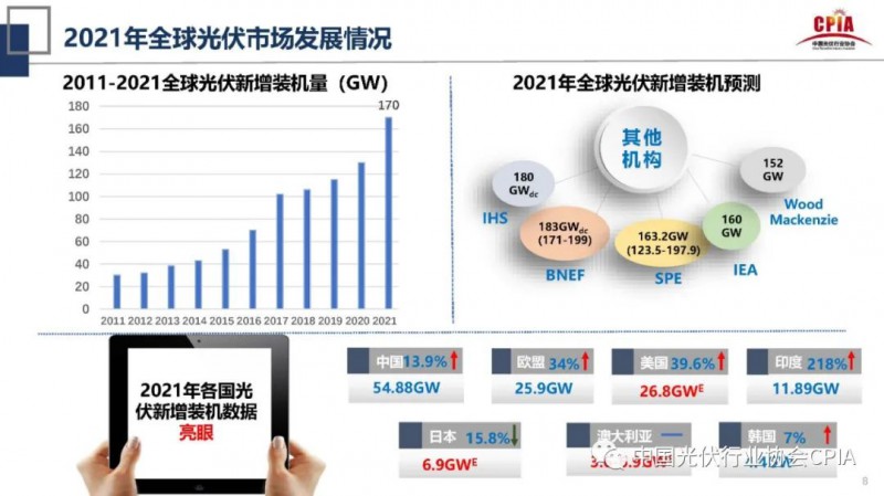 2022年2月23日,2021年發(fā)展回顧與2022年形勢展望線上研討會采用直播形式順利召開,中國光伏行業(yè)協(xié)會名譽理事長王勃華出席會議并作2021年光伏行業(yè)發(fā)展回顧與2022年形勢展望,王勃華指出,2021年我國光伏行業(yè)繼續(xù)高歌猛進(jìn),制造端,應(yīng)用端,進(jìn)出口都取得了快速增長,2022年我國光伏市場在巨大的規(guī)模儲備下或?qū)⒃鲋?5GW以上。