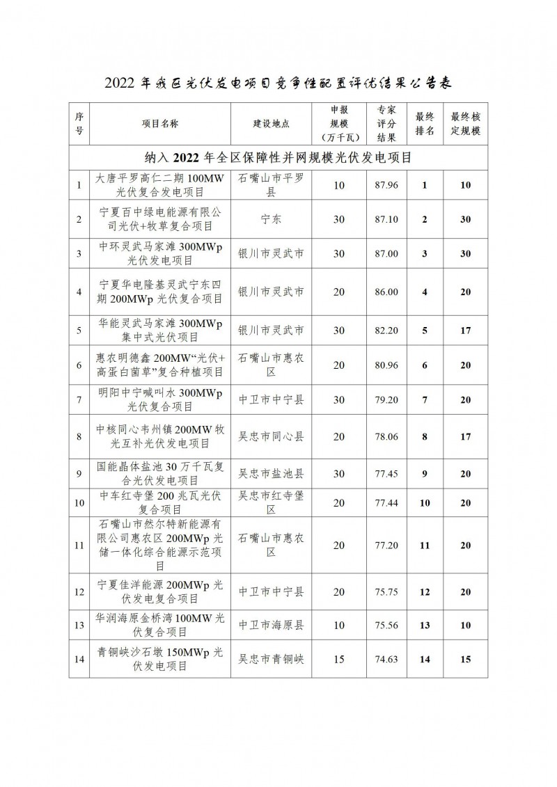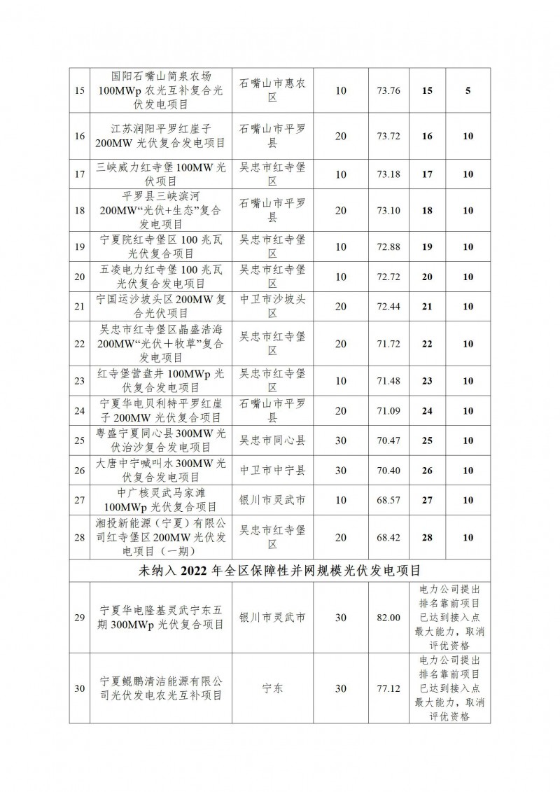 按照《自治區(qū)發(fā)展改革委關(guān)于2022年光伏發(fā)電項(xiàng)目申報(bào)有關(guān)事項(xiàng)的通知》(寧發(fā)改能源(發(fā)展)〔2022〕50號),經(jīng)過對項(xiàng)目用地及電網(wǎng)接入核查、專家評分、接入點(diǎn)超規(guī)模、合理核定項(xiàng)目容量等環(huán)節(jié),共28個(gè)404萬千瓦項(xiàng)目納入2022年全區(qū)保障性并網(wǎng)規(guī)模。