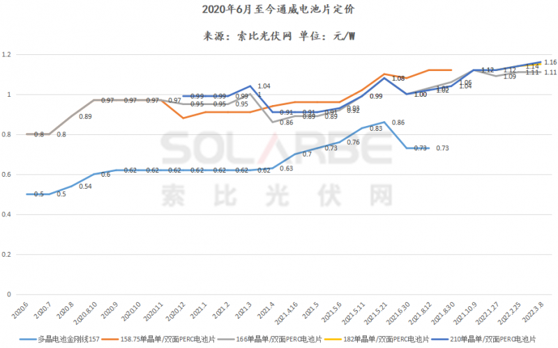 單晶 PERC 電池210(160μm 厚度)定價(jià)1.16元/瓦,上漲0.02元/瓦。