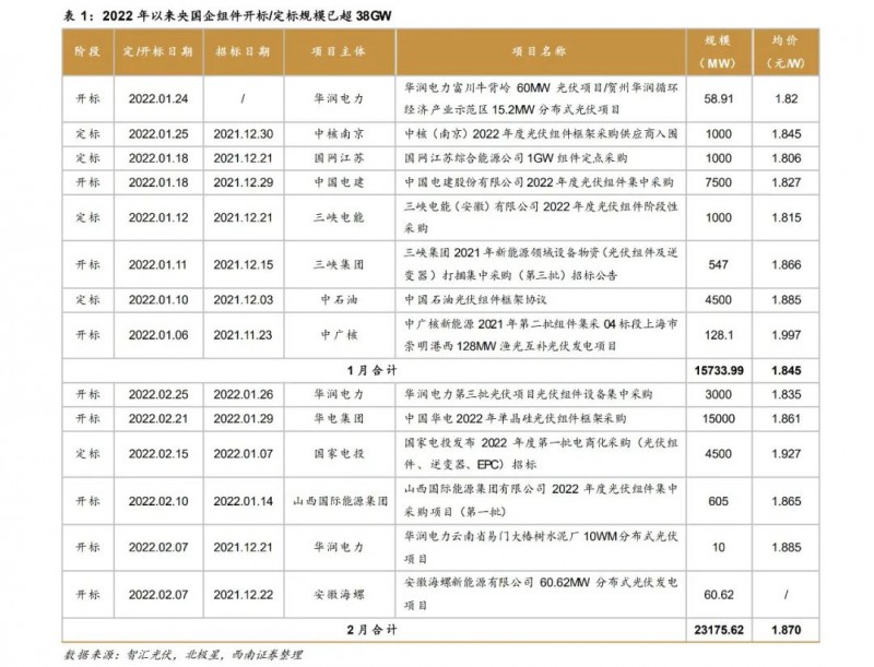 地面電站裝機(jī)需求釋放,央國企組件開標(biāo)熱潮開啟。2021年12月上旬硅片庫存去化、產(chǎn)業(yè)鏈價格回落,地面電站的組件招標(biāo)逐步啟動;疊加部分項目延期、補裝組件等因素,2022開年來終端需求呈現(xiàn)爆發(fā)式增長。根據(jù)我們統(tǒng)計,2022年1-2月,以央國企為主的組件開標(biāo)/定標(biāo)規(guī)模已達(dá)38.9GW??紤]到統(tǒng)計信息的不完全性,實際開標(biāo)/定標(biāo)規(guī)模有望達(dá)到40GW,終端需求表現(xiàn)強(qiáng)勢。