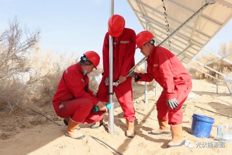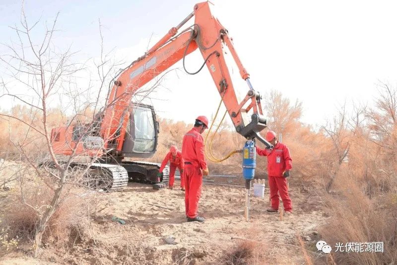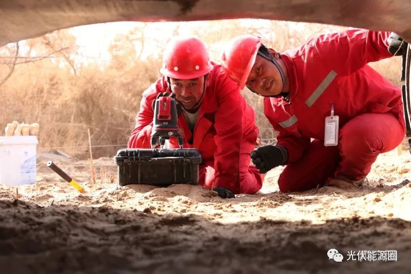 在18號(hào)水井房,記者看到,組長(zhǎng)李強(qiáng)正帶著三名工人給平整的場(chǎng)地打螺旋樁基礎(chǔ),為了保證后續(xù)安裝質(zhì)量,他們用激光水平儀、木樁、線繩在高低不平的沙地上找出水平線,然后用改裝的挖掘機(jī)將2.2米的螺旋樁按點(diǎn)位旋轉(zhuǎn)壓入地基。在挖掘機(jī)轟隆隆的嘶吼聲中,一個(gè)寬三米、長(zhǎng)16.8米的安裝面20多分鐘就完成了。