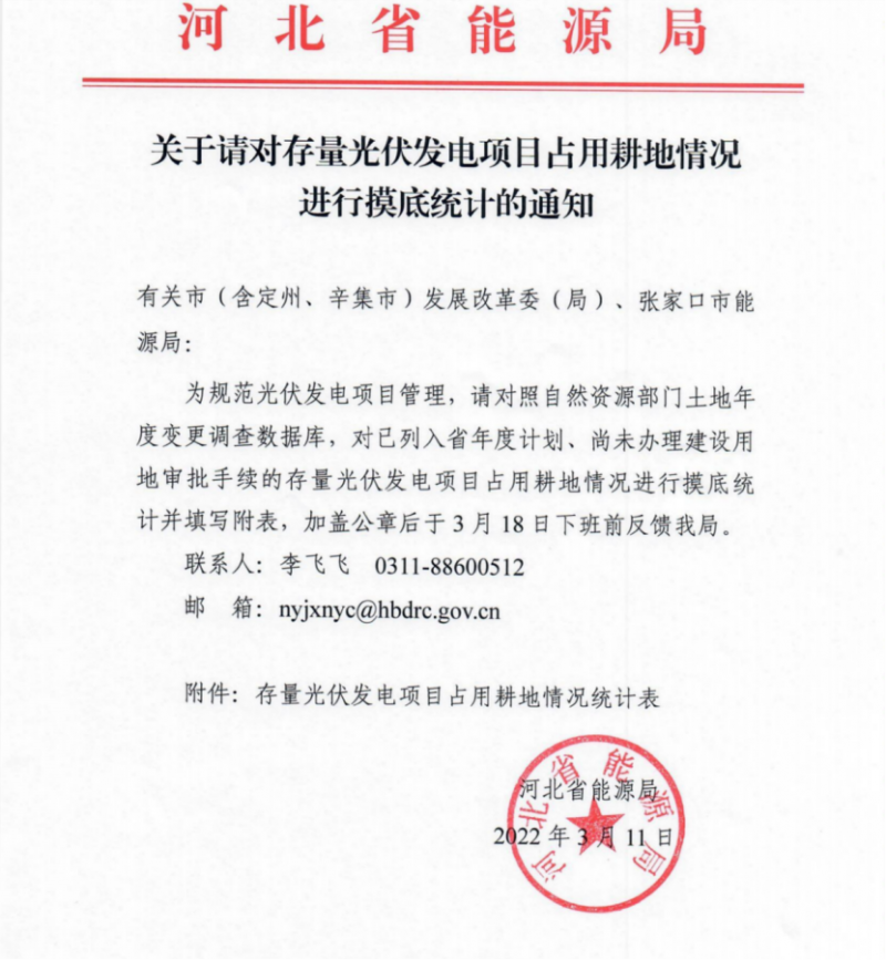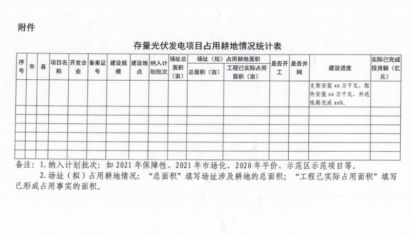 3月11日,河北省能源局啟動(dòng)存量光伏電站占用耕地摸底統(tǒng)計(jì)工作,文件要求對(duì)照自然資源部門(mén)土地年度變更調(diào)查數(shù)據(jù)庫(kù),對(duì)已列入省年度計(jì)劃、尚未辦理建設(shè)用地審批手續(xù)的存量光伏發(fā)電項(xiàng)目占用耕地情況進(jìn)行摸底統(tǒng)計(jì)。附表信息統(tǒng)計(jì)中包括項(xiàng)目名稱、開(kāi)發(fā)企業(yè)、備案證號(hào)、建設(shè)規(guī)模及地點(diǎn)、納入計(jì)劃批次以及場(chǎng)址總面積、已占用面積以及建設(shè)進(jìn)度等多項(xiàng)詳細(xì)信息。