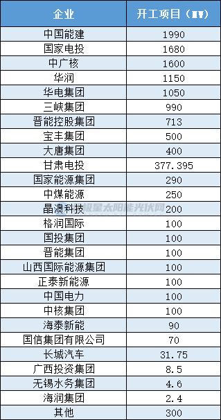 從項目建設單位來看,除了五大四小發(fā)電集團外,地方國企、事業(yè)單位、民營光伏開發(fā)商均在積極開發(fā)建設光伏項目。其中,中國能建、國家電投、中廣核、華潤、華電開工項目規(guī)模均超1GW以上;三峽集團、晉能控股、寶豐集團開工項目規(guī)模均在500MW及以上。