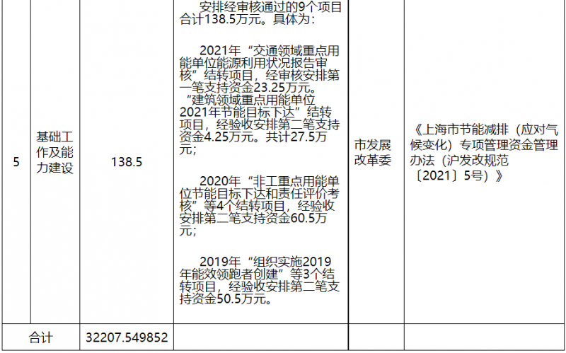 (五)按照《上海市節(jié)能減排(應(yīng)對(duì)氣候變化)專(zhuān)項(xiàng)管理資金管理辦法》(滬發(fā)改規(guī)范〔2021〕5號(hào))等規(guī)定,安排經(jīng)審核通過(guò)的9個(gè)項(xiàng)目合計(jì)138.5萬(wàn)元。具體為: