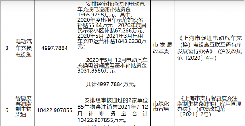 (四)按照《上海市支持餐廚廢棄油脂制生物柴油推廣應(yīng)用管理辦法》(滬發(fā)改規(guī)范〔2021〕2號(hào))規(guī)定,安排經(jīng)審核通過(guò)的2家單位B5生物柴油銷(xiāo)售2021年7-12月補(bǔ)貼資金合計(jì)10422.907855萬(wàn)元。