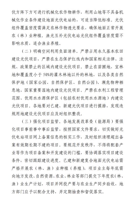 用地方面,允許在設(shè)施農(nóng)業(yè)上建設(shè)農(nóng)光互補、菌光互補項目,利用農(nóng)用地布設(shè)的光伏方陣可不改變原用地性質(zhì)。光伏復合項目應堅持“以農(nóng)為先”,新建復合地面光伏電站光伏組件安裝高度最低處不低于2米,方陣前后陣列中心間距原則上不少于7米。嚴禁占用永久基本農(nóng)田、在生態(tài)保護紅線內(nèi)以及各類自然保護地建設(shè)光伏項目。此外,已建和新建復合地面光伏電站需嚴格開展農(nóng)(林、漁)業(yè)種植(養(yǎng)殖),項目業(yè)主每年底需向地方發(fā)改委、自然資源、農(nóng)業(yè)、林業(yè)等部門提交下年度農(nóng)(林、漁)業(yè)生產(chǎn)計劃,項目并網(wǎng)投產(chǎn)要與農(nóng)業(yè)生產(chǎn)同步驗收。