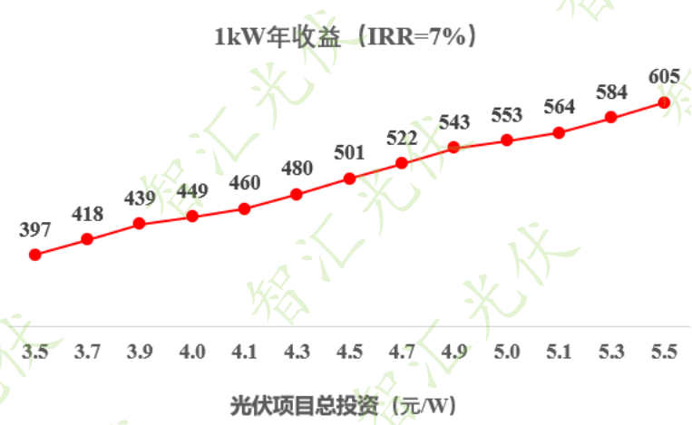 下圖中,橫坐標(biāo)為:項目的總投資,縱坐標(biāo)為:1kW年收益(年發(fā)電小時*項目電價)。即“項目總投資”與“1kW年收益”一一對應(yīng),某投資水平下,達(dá)到對應(yīng)數(shù)值時,才能達(dá)到7%內(nèi)部收益率。