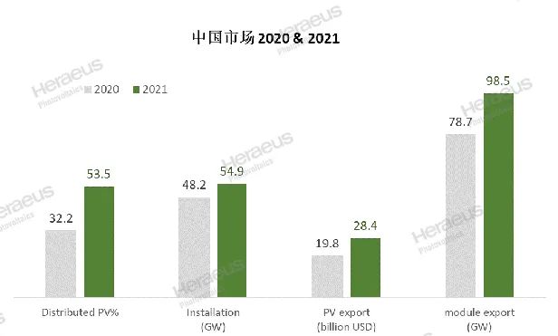 根據(jù)中國光伏協(xié)會今年二月份數(shù)據(jù),2021年中國裝機(jī)量突破了54.9GW, 和2020年相比增長了13.9%。其中分布式光伏裝機(jī)量首次超過了50%。