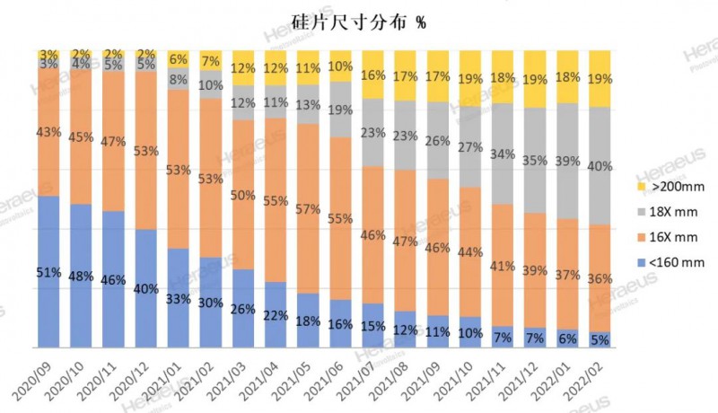 經(jīng)歷了短短不到一年半的時(shí)間,大尺寸硅片(≥M6)的市場占有率從2020年9月的49%迅速爬坡至95%。