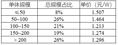 圖:不同單體規(guī)模光伏電站小EPC平均中標(biāo)價(jià)格(單位:元/W)