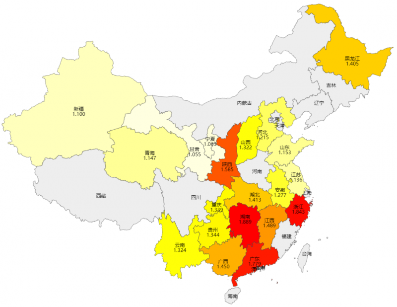 南方省份,如湖南、浙江、廣東最高,平均值在1.78~1.89元/W之間;