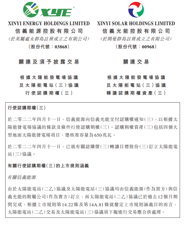 4月11日,信義能源及信義光能聯(lián)合公布公告稱,于2022年4月11日信義能源向信義光能交付認(rèn)購(gòu)權(quán)通知(三),以根據(jù)太陽(yáng)能發(fā)電場(chǎng)協(xié)議的條款及條件行使認(rèn)購(gòu)期權(quán)(三)。認(rèn)購(gòu)期權(quán)資產(chǎn)(三)包括四個(gè)大型地面太陽(yáng)能發(fā)電場(chǎng)項(xiàng)目,總核準(zhǔn)容量為650兆瓦。
