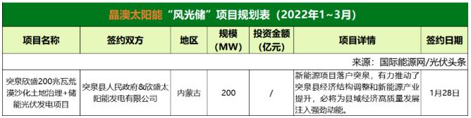 截至2022年3月31日,晶澳太陽能共簽約(規(guī)劃)1個(gè)風(fēng)光儲(chǔ)項(xiàng)目,項(xiàng)目規(guī)模為200MW。