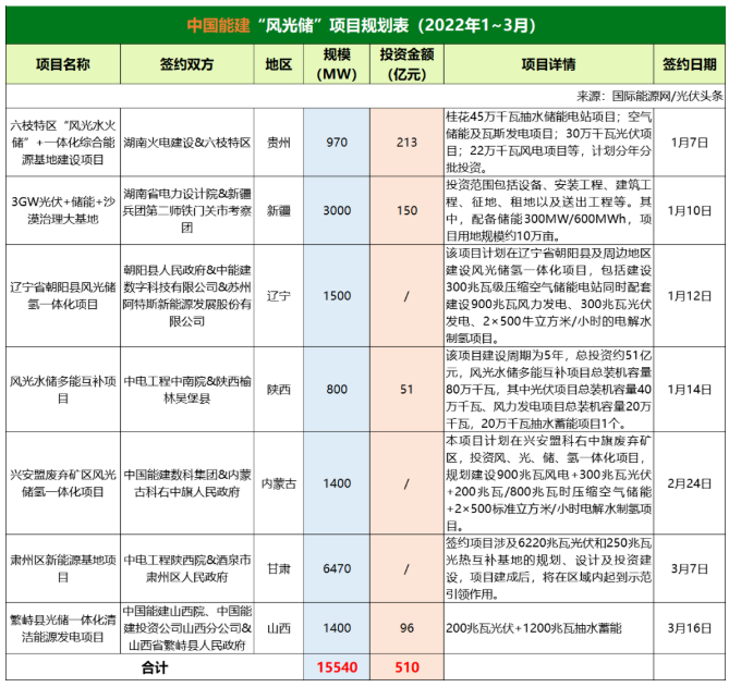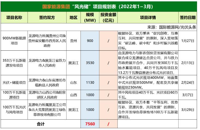 截至2022年3月31日,國家能源集團(tuán)共簽約(規(guī)劃)5個(gè)風(fēng)光儲(chǔ)項(xiàng)目,明確項(xiàng)目規(guī)模共計(jì)7.56GW。
