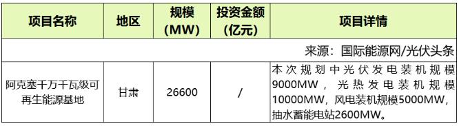值得注意的是,甘肅酒泉市阿克塞哈薩克族自治縣人民政府發(fā)布文件顯示,阿克塞千萬千瓦級可再生能源基地規(guī)劃中光伏發(fā)電裝機(jī)規(guī)模9000MW,光熱發(fā)電裝機(jī)規(guī)模10000MW,風(fēng)電裝機(jī)規(guī)模5000MW,抽水蓄能電站2600MW,規(guī)模合計(jì)26.6GW。