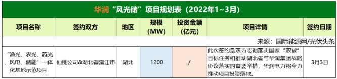 截至2022年3月31日,華潤共簽約(規(guī)劃)1個(gè)風(fēng)光儲(chǔ)項(xiàng)目,項(xiàng)目規(guī)模1.2GW。