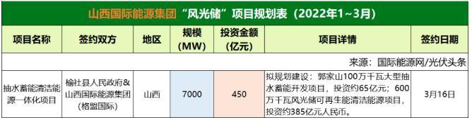 截至2022年3月31日,山西國際能源集團(tuán)共簽約(規(guī)劃)1個(gè)風(fēng)光儲(chǔ)項(xiàng)目,項(xiàng)目規(guī)模為7000MW,投資金額450億元。