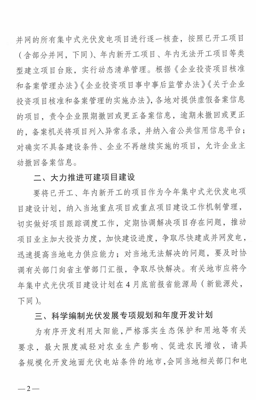 2.大力推進(jìn)可建項(xiàng)目建設(shè):要將已開(kāi)工、年內(nèi)新開(kāi)工的項(xiàng)目作為今年集中式光伏發(fā)電項(xiàng)目建設(shè)計(jì)劃,納入當(dāng)?shù)刂攸c(diǎn)項(xiàng)目或重點(diǎn)項(xiàng)目建設(shè)工作機(jī)制管理,