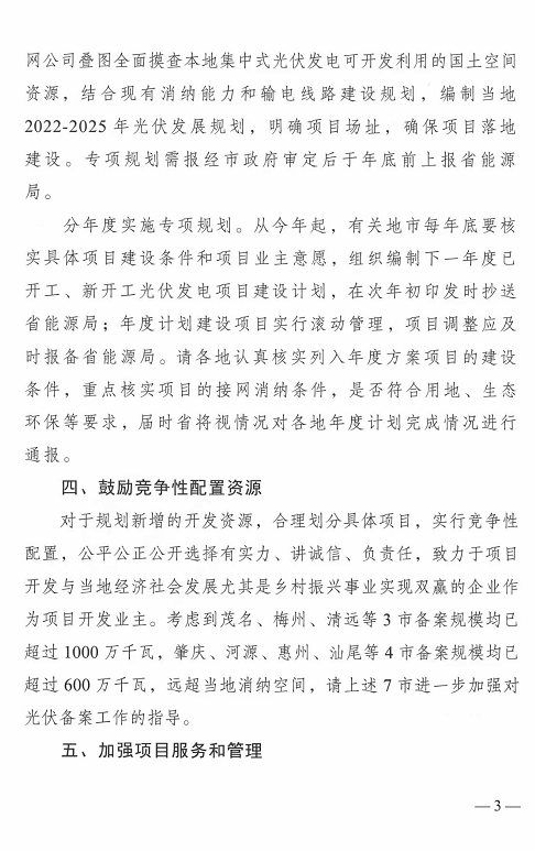5.加強(qiáng)項(xiàng)目服務(wù)及管理:著力解決光伏發(fā)電項(xiàng)目有關(guān)用地、接入送出等方面的突出問(wèn)題,推動(dòng)依法嚴(yán)厲打擊囤積倒賣資源、不正當(dāng)惡性競(jìng)爭(zhēng)等違法違規(guī)行為。