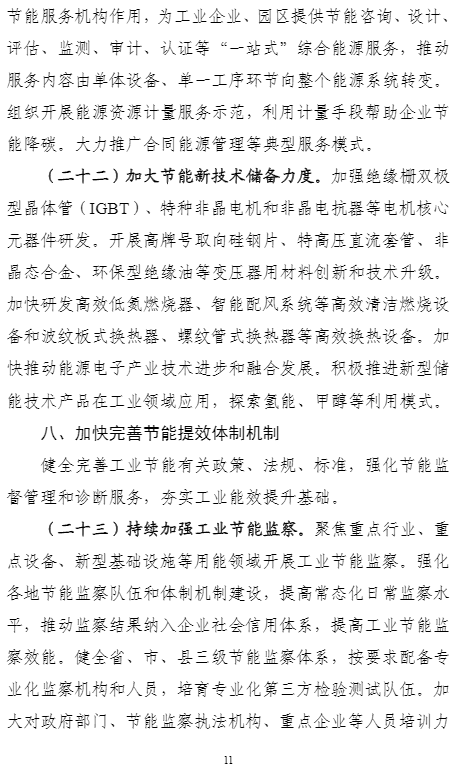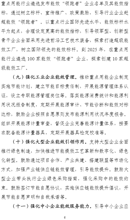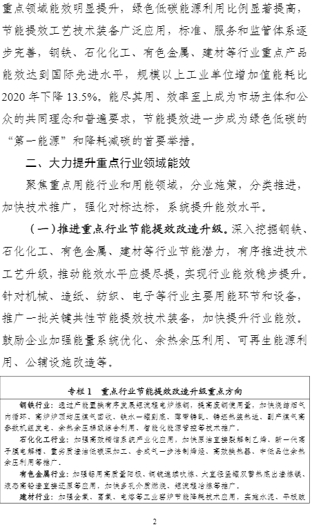 計劃提出,到2025年,重點工業(yè)行業(yè)能效全面提升,數(shù)據(jù)中心等重點領(lǐng)域能效明顯提升,綠色低碳能源利用比例顯著提高,節(jié)能提效工藝技術(shù)裝備廣泛應(yīng)用,標(biāo)準、服務(wù)和監(jiān)管體系逐步完善,鋼鐵、石化化工、有色金屬、建材等行業(yè)重點產(chǎn)品能效達到國際先進水平,規(guī)模以上工業(yè)單位增加值能耗比2020年下降13.5%。能盡其用、效率至上成為市場主體和公眾的共同理念和普遍要求,節(jié)能提效進一步成為綠色低碳的“第一能源”和降耗減碳的首要舉措。