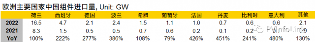 目前中國(guó)主要出口成長(zhǎng)的區(qū)域市場(chǎng),仍是目前能源轉(zhuǎn)型最積極,同時(shí)也因俄羅斯和烏克蘭沖突下能源供應(yīng)不穩(wěn)定而面臨能源危機(jī)的歐洲。歐洲五月從中國(guó)進(jìn)口了8.9GW的光伏組件,同比成長(zhǎng)146%,1 – 5月則是累計(jì)了33.3GW,同比成長(zhǎng)144%,為各區(qū)域市場(chǎng)中成長(zhǎng)最高。2021年歐洲全年進(jìn)口量已經(jīng)是最高的40.9GW,占中國(guó)2021年出口的46%,在基期已高且今年仍呈現(xiàn)逐月成長(zhǎng)的態(tài)勢(shì)下,印證了歐洲市場(chǎng)對(duì)于光伏產(chǎn)品的需求仍然強(qiáng)勁。