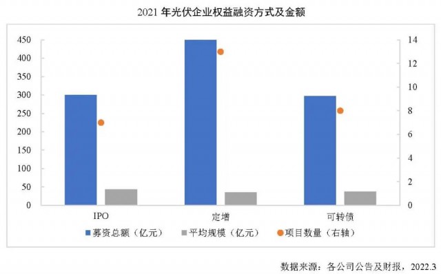 2021年我國(guó)光伏行業(yè)融資環(huán)境持續(xù)改善,共27家光伏企業(yè)在A股及港股資本市場(chǎng)使用權(quán)益融資方式募資,涉及權(quán)益融資項(xiàng)目28個(gè),募資總額1058.33億元,同比增長(zhǎng)48.2%。其中,再融資項(xiàng)目21個(gè),募集資金758億元,同比增長(zhǎng)30%;IPO上市融資項(xiàng)目7個(gè),募集資金301億元,同比增長(zhǎng)129.2%。截至2022年3月,2021年權(quán)益融資項(xiàng)目中,已完成融資合計(jì)700.77億元,同比增長(zhǎng)16.3%。