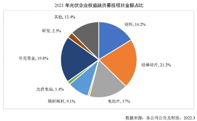 從募集資金用途看,約64%募集資金計(jì)劃用于擴(kuò)充光伏產(chǎn)能。此外,用于補(bǔ)充流動(dòng)資金/營(yíng)運(yùn)資金的募資投向達(dá)181.6億元,同比+25.7%,可見(jiàn)隨著光伏企業(yè)經(jīng)營(yíng)規(guī)模的擴(kuò)大,對(duì)經(jīng)營(yíng)流動(dòng)資金的需求也在提高。