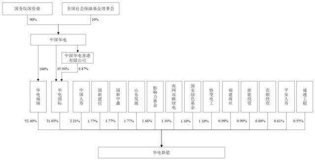 華電新能源的控股股東為華電福瑞,實際控制人為中國華電。華電福瑞持有發(fā)行人52.40%的股份,為發(fā)行人的直接控股股東;華電國際持有發(fā)行人31.03%的股份,與華電福瑞同受中國華電控制。中國華電通過其全資子公司華電福瑞間接控制公司52.40%的股份,通過其控股的華電國際間接控制公司31.03%的股份,合計控制公司83.43%的股份。