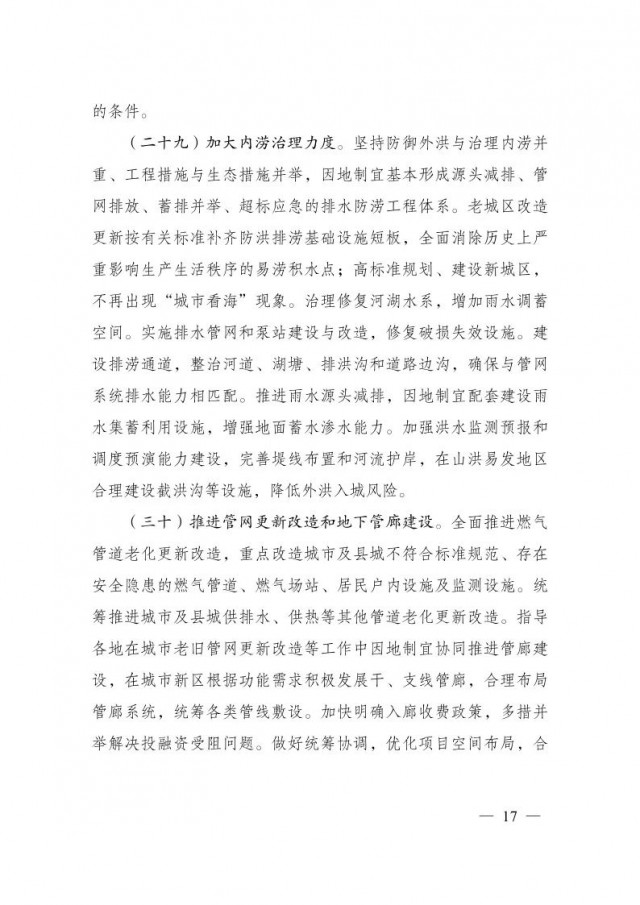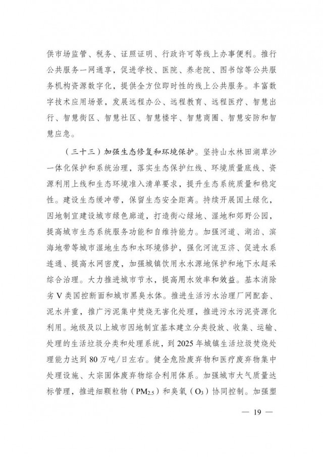 《方案》提出,到2025年,城市可持續(xù)發(fā)展能力明顯增強(qiáng),城鎮(zhèn)開發(fā)邊界全面劃定,新增建設(shè)用地規(guī)??刂圃?950萬畝以內(nèi),城市內(nèi)澇治理取得明顯成效,城市燃?xì)獾裙艿览匣赂脑焐钊胪七M(jìn),能源資源利用效率大幅提升,城市黑臭水體基本消除,地級(jí)及以上城市空氣質(zhì)量優(yōu)良天數(shù)比率提高到87.5%,城市建成區(qū)綠化覆蓋率超過43%。系統(tǒng)完備、科學(xué)規(guī)范、運(yùn)行有效的城市治理體系基本建立,治理能力明顯增強(qiáng)。