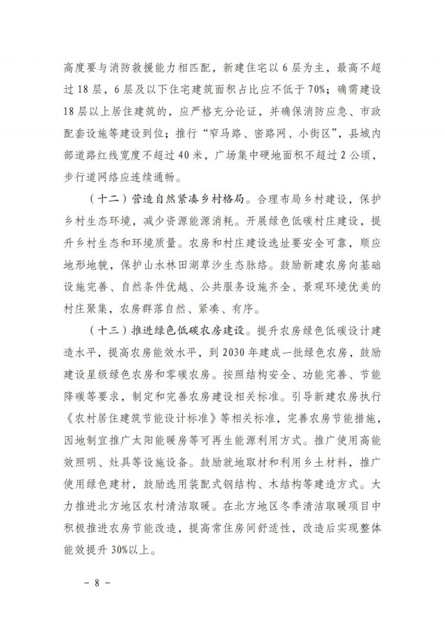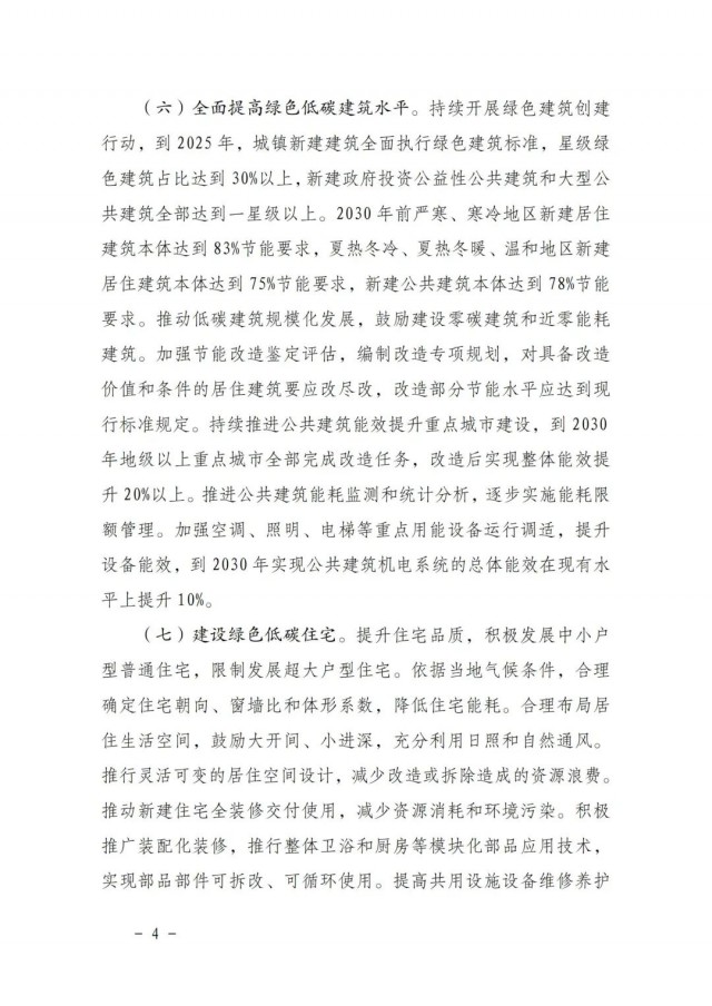 《方案》指出,全面提高綠色低碳建筑水平。持續(xù)開展綠色建筑創(chuàng)建行動,到2025年,城鎮(zhèn)新建建筑全面執(zhí)行綠色建筑標準,星級綠色建筑占比達到30%以上,新建政府投資公益性公共建筑和大型公共建筑全部達到一星級以上。2030年前嚴寒、寒冷地區(qū)新建居住建筑本體達到83%節(jié)能要求,夏熱冬冷、夏熱冬暖、溫和地區(qū)新建居住建筑本體達到75%節(jié)能要求,新建公共建筑本體達到78%節(jié)能要求。推動低碳建筑規(guī)模化發(fā)展,鼓勵建設(shè)零碳建筑和近零能耗建筑。