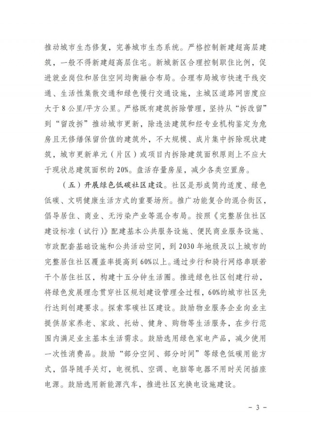 《方案》提出開展綠色低碳社區(qū)建設(shè)。推廣功能復合的混合街區(qū),倡導居住、商業(yè)、無污染產(chǎn)業(yè)等混合布局。按照《完整居住社區(qū)建設(shè)標準(試行)》配建基本公共服務設(shè)施、便民商業(yè)服務設(shè)施、市政配套基礎(chǔ)設(shè)施和公共活動空間,到2030年地級及以上城市的完整居住社區(qū)覆蓋率提高到60%以上。通過步行和騎行網(wǎng)絡串聯(lián)若干個居住社區(qū),構(gòu)建十五分鐘生活圈。推進綠色社區(qū)創(chuàng)建行動,將綠色發(fā)展理念貫穿社區(qū)規(guī)劃建設(shè)管理全過程,60%的城市社區(qū)先行達到創(chuàng)建要求。探索零碳社區(qū)建設(shè)。鼓勵物業(yè)服務企業(yè)向業(yè)主提供居家養(yǎng)老、家政、托幼、健身、購物等生活服務,在步行范圍內(nèi)滿足業(yè)主基本生活需求。鼓勵選用綠色家電產(chǎn)品,減少使用一次性消費品。鼓勵“部分空間、部分時間”等綠色低碳用能方式,倡導隨手關(guān)燈,電視機、空調(diào)、電腦等電器不用時關(guān)閉插座電源。鼓勵選用新能源汽車,推進社區(qū)充換電設(shè)施建設(shè)。