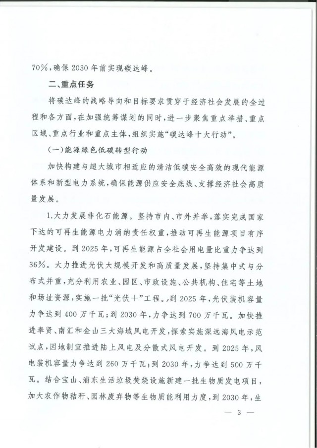 能源綠色低碳轉型行動提出,到2025年,可再生能源占全社會用電量比重力爭達到36%。堅持集中式與分布式并重,實施一批“光伏+“工程。到2025年,光伏裝機容量力爭達到400萬千瓦;到2030年,力爭達到700萬千瓦。加快推進奉賢、南匯和金山三大海域風電開發(fā),探索實施深遠海風電示范試點,因地制宜推進陸上風電及分散式風電開發(fā)。到2025年,風電裝機容量力爭達到260萬千瓦;到2030年,力爭達到500萬千瓦。結合寶山、浦東生活垃圾焚燒設施新建一批生物質發(fā)電項目,到2030年,生物質發(fā)電裝機容量達到84萬千瓦。