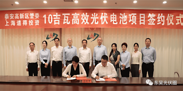 泰安高新區(qū)黨工委委員、高新發(fā)展集團(tuán)黨委書記、董事長姚來新與道得投資風(fēng)控總監(jiān)劉靜雯簽訂項目合作協(xié)議。據(jù)了解,該項目總投資40億元以上,將分為兩期建設(shè),首期建設(shè)5吉瓦TOPCon電池生產(chǎn)線,二期建設(shè)5吉瓦TOPCon電池生產(chǎn)線。該項目旨在整合新能源產(chǎn)業(yè)鏈,助力實現(xiàn)雙碳戰(zhàn)略,預(yù)計年可實現(xiàn)產(chǎn)值120億元以上,5年內(nèi)累計繳稅15億元以上。