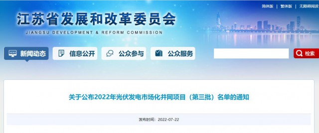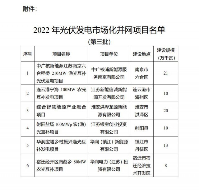 為積極貫徹落實國家“碳達(dá)峰碳中和”長期目標(biāo),推動我省光伏發(fā)電平穩(wěn)有序發(fā)展,按照《省發(fā)展改革委關(guān)于開展2022年光伏發(fā)電市場化并網(wǎng)項目開發(fā)建設(shè)的通知》(蘇發(fā)改能源發(fā)〔2022〕350號)有關(guān)要求,現(xiàn)將我省2022年光伏發(fā)電市場化并網(wǎng)項目(第三批)名單予以公布。