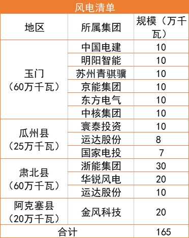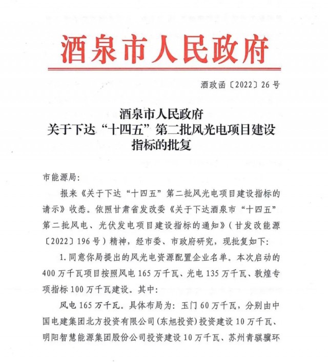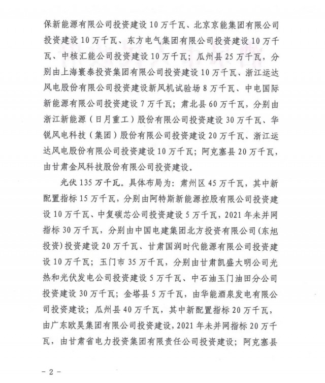 7月22日,甘肅酒泉市人民政府下發(fā)“十四五”第二批風光項目建設指標的批復,按照風電1.65GW、光伏1.35GW以及敦煌1GW專項指標劃分,規(guī)??傆嫗?GW,光伏、風電總規(guī)模各為2GW。