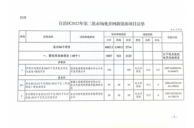 新疆2022年第二批市場化并網(wǎng)新能源項(xiàng)目清單,總計(jì)66個(gè)項(xiàng)目,規(guī)??傆?jì)為40.63GW,其中光伏為27.14GW,風(fēng)電為13.49GW。