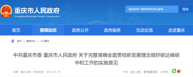 7月29日,中共重慶市委、重慶市人民政府出臺(tái)關(guān)于完整準(zhǔn)確全面貫徹新發(fā)展理念做好碳達(dá)峰碳中和工作的實(shí)施意見(以下簡(jiǎn)稱“意見”)。