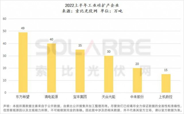 經(jīng)公開(kāi)信息統(tǒng)計(jì),東方希望、清電能源、寶豐集團(tuán)、天合光能、中來(lái)股份、上機(jī)數(shù)控六家企業(yè)上半年共計(jì)擴(kuò)產(chǎn)189萬(wàn)噸工業(yè)硅,且工業(yè)硅擴(kuò)產(chǎn)規(guī)模均超出配套多晶硅產(chǎn)量。
